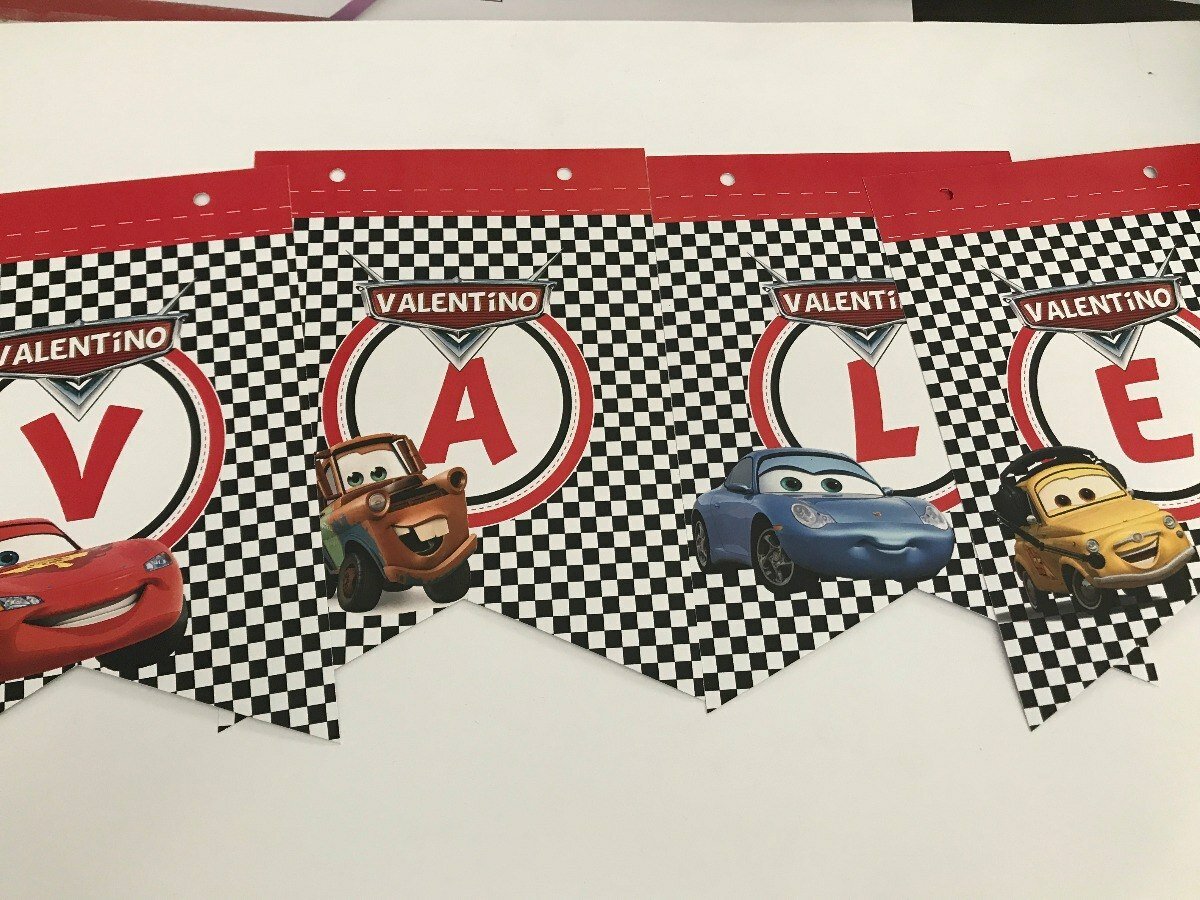 Estas guirnaldas con temática infantil de Cars como has de imaginar están inspirados en la película por tanto, los puedes encontrar dedicados a los personajes de la serie, tal vez solo de rayo Mcqueen o dedicada a las carreras de autos, estilo Nascar como hemos visto en la vida, en recuadros negros y blancos.